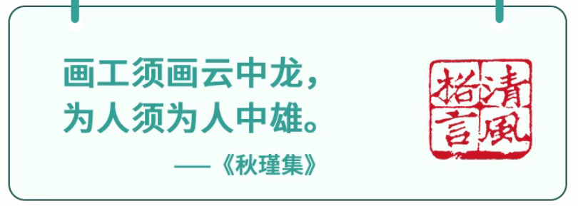 对于画工来说,寻常景致都不过应酬之笔,只有那云中神龙,天地召唤,风雨随行,画工尽情描绘之际,能随笔触神游四海,挥洒出非凡气象,才不枉费了这番技艺。同样,为人处世,也要有云中画龙的志向与豪情,如鉴湖女侠般,要为这天下立壮志、树雄心。