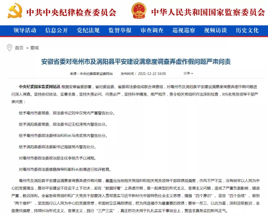 2021年12月22日,安徽省纪委监委发布安徽省委对亳州市及涡阳县平安建设满意度调查弄虚作假问题严肃问责的通报,亳州市委常委、政法委书记刘中汉等6人被问责。通报显示,亳州市及涡阳县平安建设满意度调查弄虚作假问题,暴露出当地相关党组织和相关党员领导干部政绩观偏差,作风不严不实,没有树牢以人民为中心的发展理念,推动平安建设不在实干上下工夫,却在“数据好看”上弄虚作假,是一起典型的形式主义、官僚主义问题,造成了严重负面影响,错误严重,教训深刻。