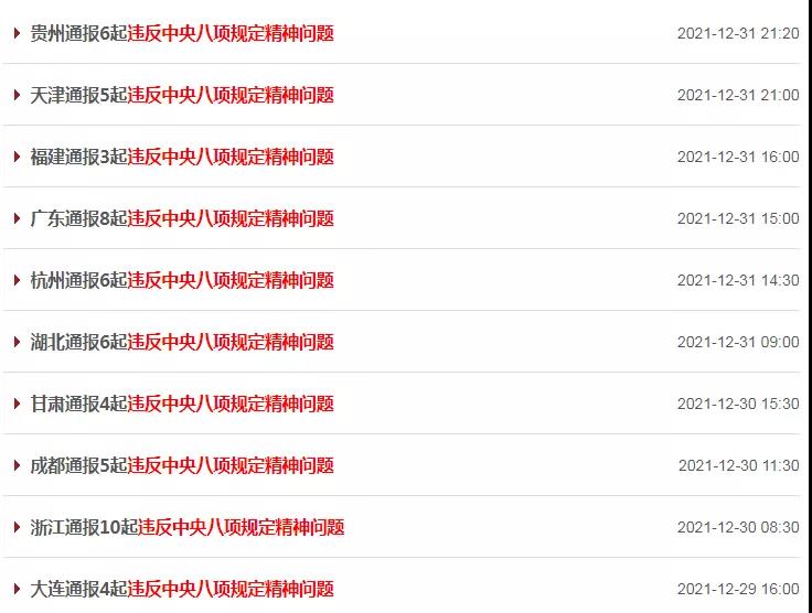 2021年12月27日,中央纪委国家监委公开通报十起违反中央八项规定精神典型问题,其中5起为中管干部风腐一体的严重违纪违法案件,5起为厅局级以下干部违反中央八项规定精神的问题。临近节点,北京、贵州、广东、杭州等各地纪检监察机关也密集通报违反中央八项规定精神典型问题一百余起,涵盖违规收送名贵特产和礼品礼金、违规吃喝、违规发放津补贴或福利等常见“四风”问题。