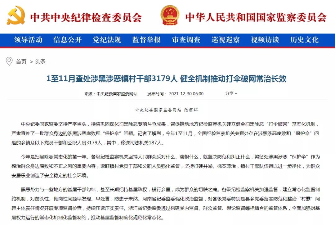05 扫黑除恶常态化!2021年1至11月查处涉黑涉恶镇村干部3179人