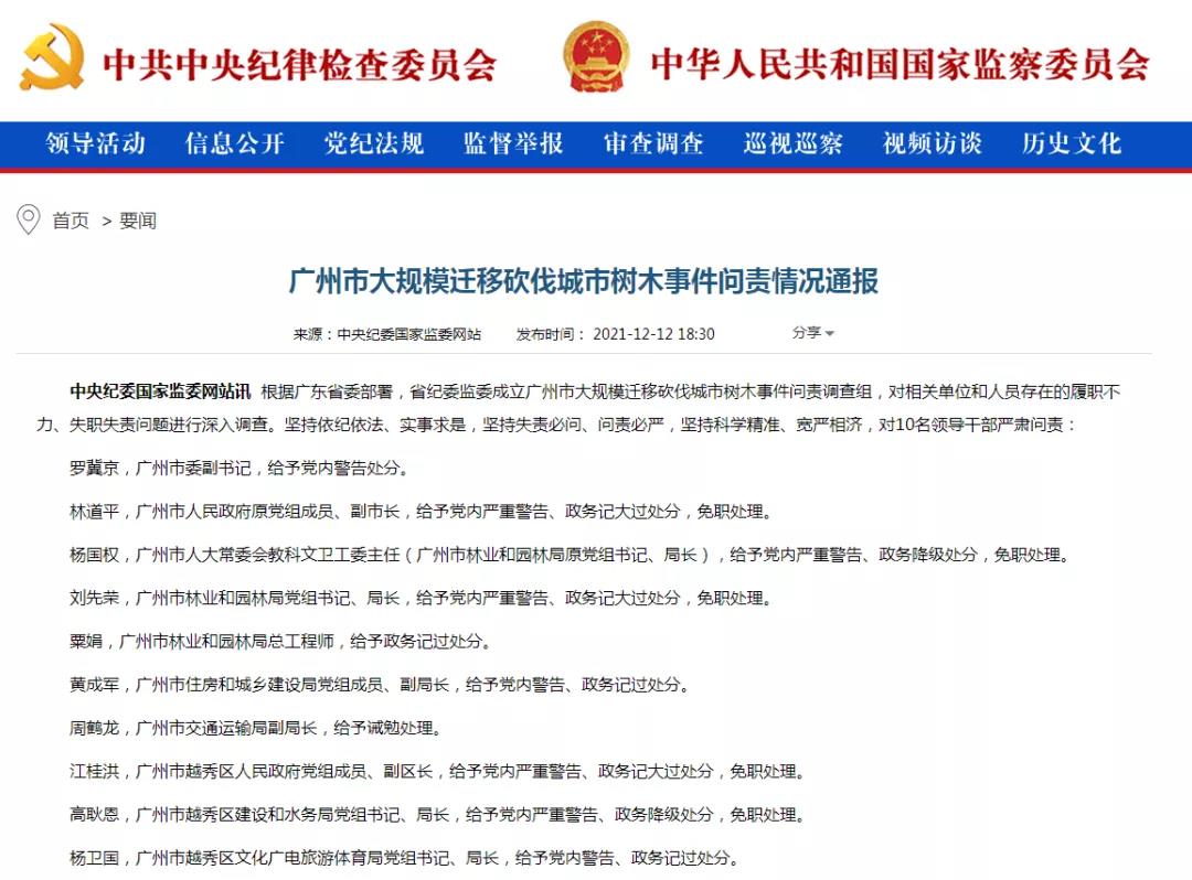 2021年12月12日,广州市大规模迁移砍伐城市树木事件问责情况通报发布,广州市委副书记罗冀京、广州市人民政府原副市长林道平等10名领导干部被问责。通报显示,广州市大规模迁移砍伐城市树木,严重损毁了一批大树老树,破坏了城市自然生态环境和历史文化风貌,伤害了人民群众对城市的美好记忆和深厚感情,是典型的破坏性“建设”行为,造成了重大负面影响和不可挽回的损失,错误严重,教训深刻。
